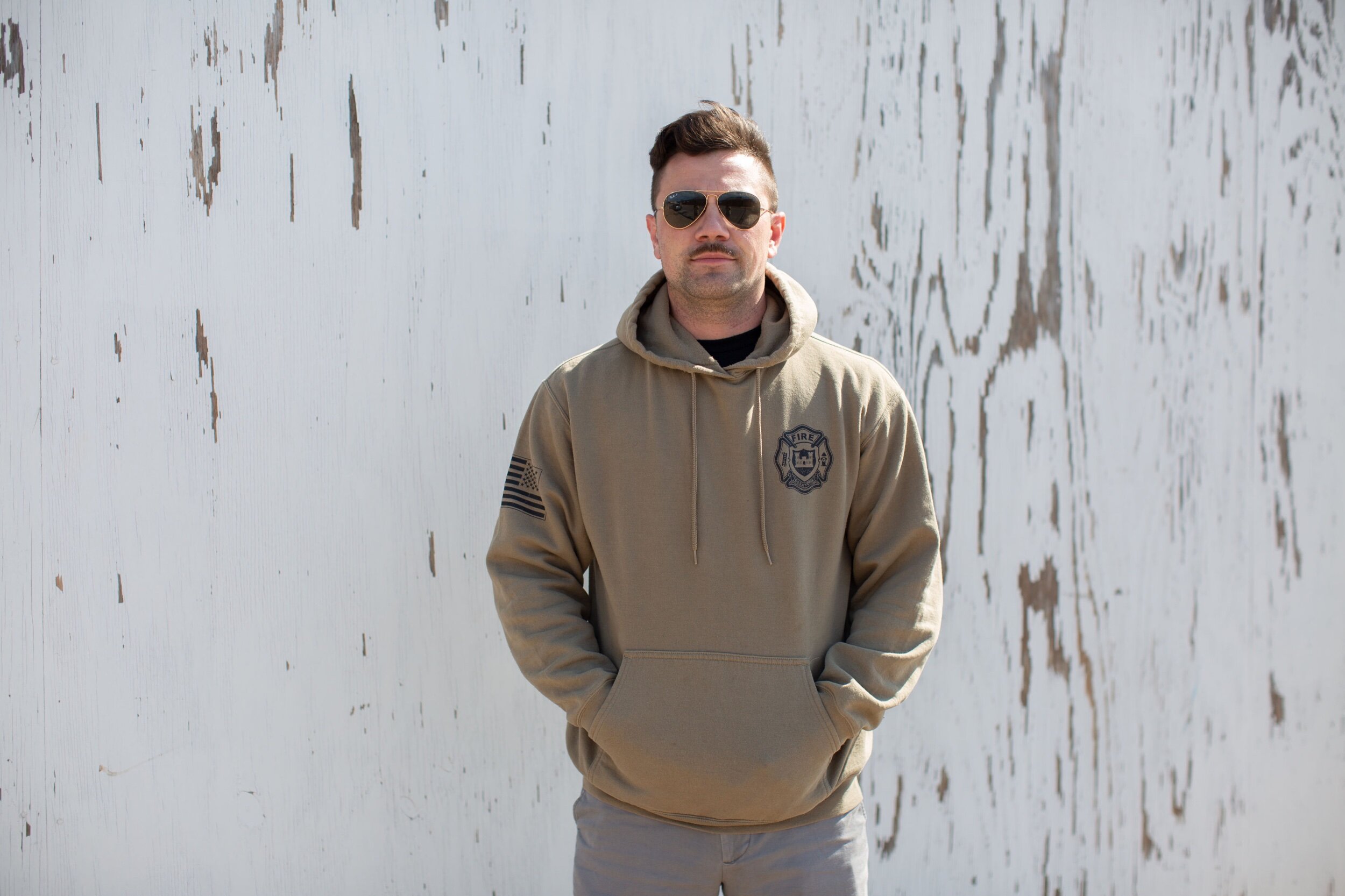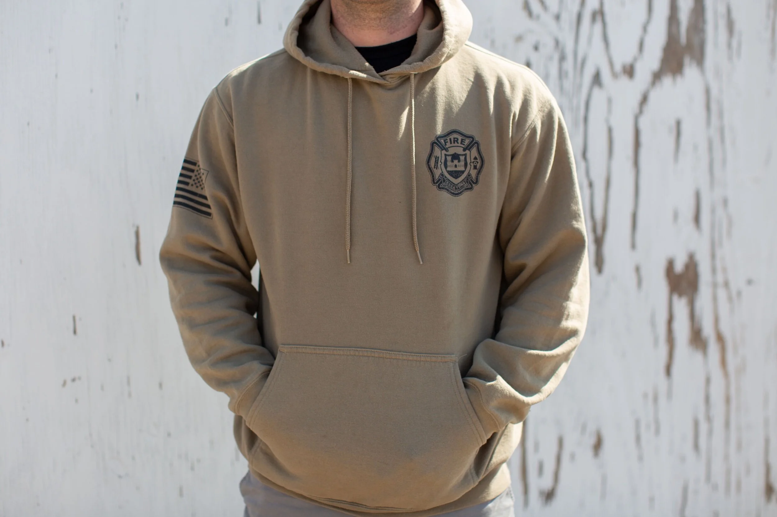 The original US Army Firefighter 12 Mike crest on a coyote tan hoodie.